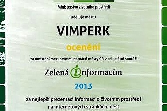 „Soutěž nazvanou „Zelená informacím“ pořádalo občanské sdružení Timur a organizace CI2, o.p.s. pod záštitou Ministerstva životního prostředí a Svazu města a obcí ČR. Při slavnostním vyhlášení 5. prosince jsme tedy na Ministerstvu životního prostředí převzali diplom za celkově 13. místo a vyslechli si několik zajímavých příspěvků kolegů z jiných měst i přednášku pořadatelů na téma ekologického reportingu ve státní správě a samosprávě. Cílem do příštího roku je tedy opět dobré úmístění, ale hlavně další vylepšování stránek o životním prostředí ve Vimperku a okolí tak, aby byly pro návštěvníky ještě přehlednější a přínosnější.“