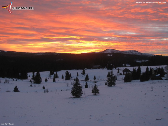 Druhý prosincový týden byl ve znamení inverze. V úterý 10. prosince byl pořízen velmi pěkný ranní záběr na Filipově Huti. Mlha a slunce, stejné ráno jen o pár kilometrů dál na Kvildě. Povedený záběr doplňuje rampouch, který bohužel zlikvidovaly sluneční paprsky. Pás mlhy na Březníku a překrásná zimní atmosféra, stejně tak úterní odpolední záběr z Poledníku, kdy nízká oblačnost z části zakrývala vrchol. Nekonečné „moře“ nízké oblačnosti, to jsou záběry z webkamer Malý Ostrý a Libín. Středa odpoledne připravila z Vítkova Kamene parádní pohled na Alpy a nízkou inverzní oblačnost v Rakousku. Čtvrtek ráno a opět nízká oblačnost, tentokrát ze Svatoboru. Na záběru je vidět i pára z chladících věží temelínské elektrárny. V pátek ráno byl zajímavý pohled na Frymburk, přes který se nasunul pruh nízké oblačnosti. Další dva záběry jsou z Kvildy, dvě odlišná svítání. Poslední záběr připravil na Filipově Huti přímo barevnou scenérii po západu slunce.