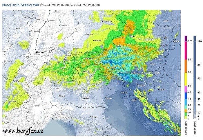 Mapa předpokladu nově napadlého sněhu, zdroj bergfex.cz: