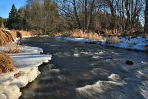 Sněhová pokrývka v okolí řeky Blanice roztála již v polovině prosince 2013. Zbytky sněhu na loukách moc nepřipomínají nejstudenější měsíc roku, kterým leden obyčejně bývá.