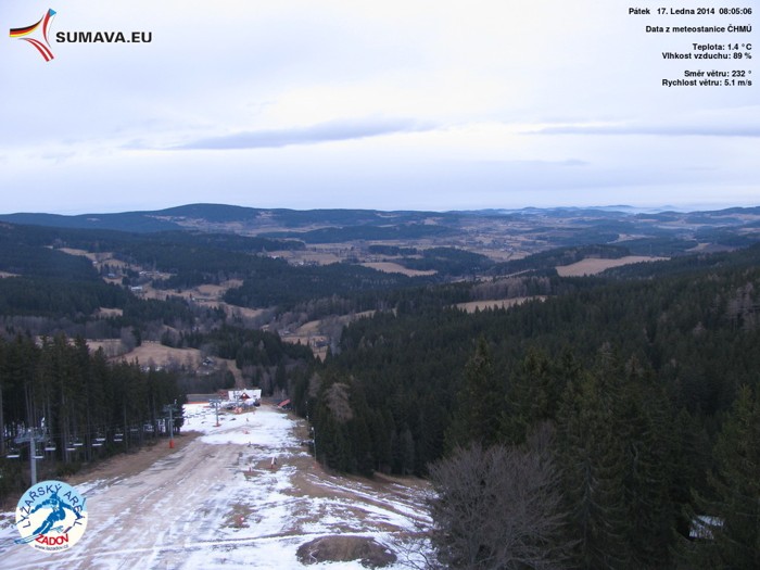 Před týdnem jsme slibovali pozvolné ochlazování. To sice přišlo, ale nakonec mnohem méně výrazné, než z počátku modely předpovídaly. Inverzní ráz počasí byl přerušen přechodem slabé fronty z úterý 14. ledna na středu 15. ledna, která přinesla slabé sněhové srážky do všech šumavských poloh. Nejvíce sněhu napadlo v okolí Hojsovy Stráže, kde na stanici ČHMÚ zaznamenali 8 cm nového sněhu. Většinou však napadlo jen od poprašku do 5 cm. Na českokrumlkovsku se vyskytly lokality, kde srážky nepadaly vůbec. Chladný vzduch však vystřídalo opět teplejší proudění a tak nově napadlý sníh začal rychle odtávat, udržel se jen v polohách nad 1100 metrů. Nejnižší teploty za uplynulý týden byly v pondělí 13. ledna, na Rokytské slati -17,6°C, na Březníku a na Perle shodně -17,1°C.