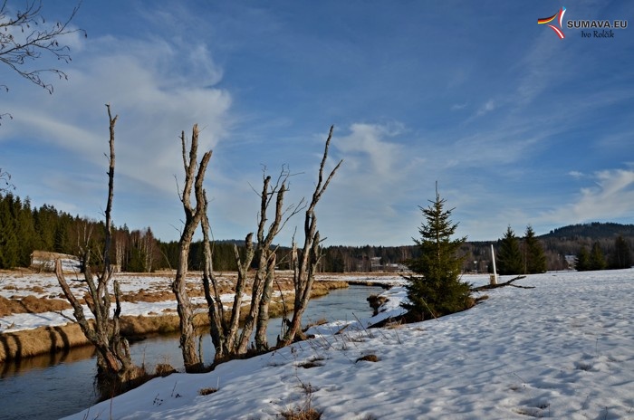 Státní hranici zde tvoří meandrující Studená Vltava, která zde i přes noční mrazivé teploty není vůbec zamrzlá, což dokládají naše snímky, pořízené 18. ledna.