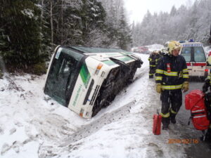 Aktuálně / ověřeno: Informace od hasičů Děti na lyžařský výcvik do Železné Rudy nedojely, autobus se v serpentinách u Gerlovy Hutě převrátil na bok do