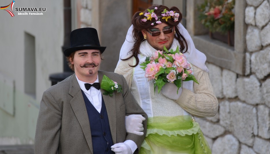 Na masopustní veselí ve Vimperku se dívalo i sluníčko. Bylo nádherné počasí, propracované maškary nezapomněly vzít do průvodu muziku, hospodáři a hospodyně vytahovali pohoštění (pevné i tekuté), za to byli „odměněni“ tanečkem s medvědem nebo nevěstou…. Prostě masopust jak má být!