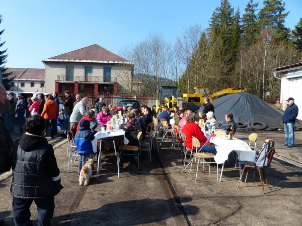 Je krásné, již jarní počasí, celkem teplo na začátek března na Šumav,ě a tak je řada prostřených stolů venku, na nádvoří. Nechybí na nich chlebíčky, domácí štrůdl, alko i nealko nápoje, v nabídce je káva, čaj nebo grog pro zimomřivé. Na rožni se otáčí celé sele, voní a chutná již od pohledu a všem se sbíhají sliny. Kůžička správně opečená, maso se jen rozsýpá. U jednoho ze stolů se losuje z lístků, které dostane každý při dovozu paliva, celkem pět šťastlivců. Ti dostanou uhlí v letošním roce zdarma. První cena tak putuje do Nezdic u Sušice a zbytek zůstává v jihočeském kraji.