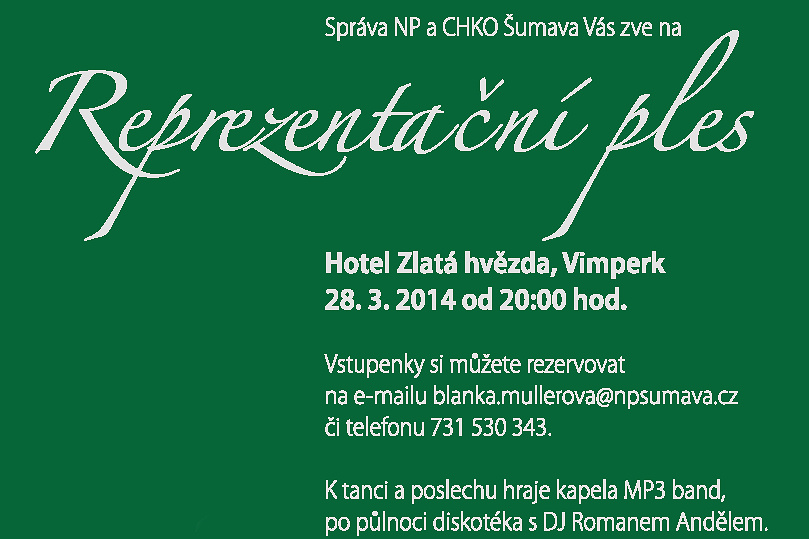 Ale i pokud nebuete mezi prvními pěti volajícími, určitě si lístek na Reprezentační ples Správy NP a CHKO Šumava zarezervujte. Čeká vás večer s příjemnou hudou a zábavou, po půlnoci diskotéka.
