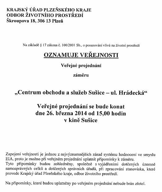 Veřejné projednání vyhodnocení vlivu projektu na životní prostředí (EIA), pro záměr výstavby Centra obchodu a služeb v Sušici (ul. Hrádecká), bude probíhat dnes odpoledne v sušickém kině.