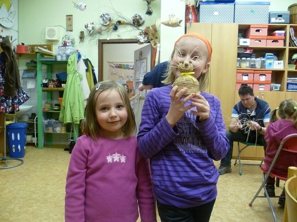Byl to totiž zajíc, příjmením Velikonoční, a ne ledajaký! Vyrobený z pedigu. Kdo to nikdy nezkusil, možná si myslí, že je to hračka, vyrobit velikonočního zajíčka z ‚proutí‘, ale pozor! ‚Ono je to jako živé‘ a než se ze změti proutků začně rýsovat nějaký tvar, dá to netrénovaným rukám pěkně zabrat. Ne tak ovšem šikovným prstům dětí, maminek (a tatínků) ze školní družiny Pampeliška při ZŠ Lerchova, které ve třídě Mirky Pokorné vyrábějí z pedigu krásné věci už jako zkušení profíci. A líbí se jim to, jak nám sami napsali: