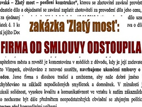 Posílení konstrukce Zlatého mostu, akce která je diskutovaná mezi zastupiteli i veřejností od září loňského roku a  střídavě je názorově spojuje a rozděluje, se tak opět odsouvá. Na výběr nového dodavatele musí být vypsáno nové výběrové řízení. Firma  od smouvy odstoupila  v den,  kdy měla podle dodatku ke smlouvě převzít staveniště a zahájit práce tak, aby byly ukončené k 30. květnu letošního roku.