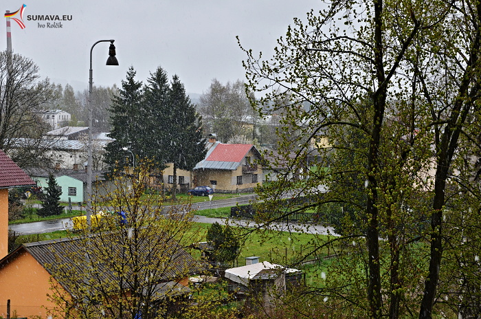 Sněžení ve Volarech 3. května před 10. hodinou: