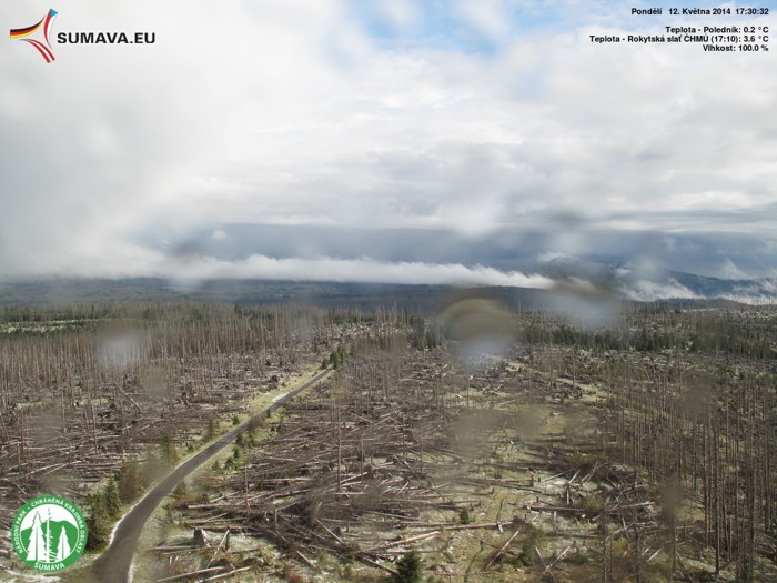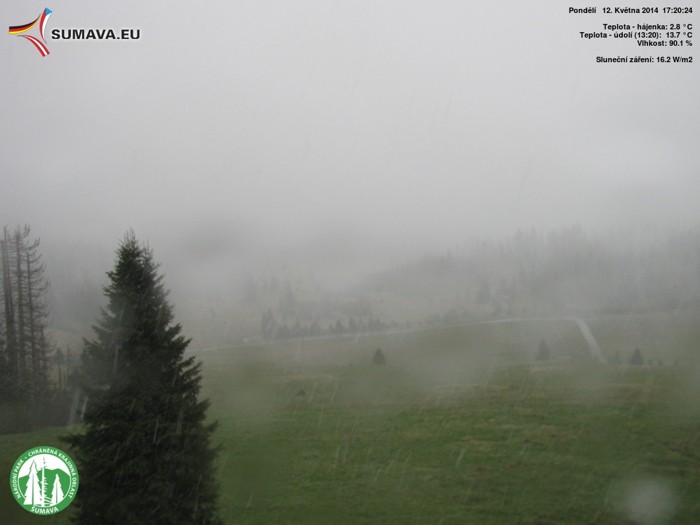 Chladnější ráz počasí s velkou oblačností pokračuje. Alespoň částečně zmenšená oblačnost byla nad Šumavou v sobotu 10. května, kdy teploty dosahovaly 15°C až 19°C. V neděli už bylo hodně oblačnosti s občasným deštěm, který vydržel i v pondělí, navíc teploty se v horských polohách pohybovaly jen slabě nad nulou, přeháňky tak byly v polohách nad 1100 metrů sněhové. Krátce se sněhová pokrývka udžela například na Poledníku, což dokládá snímek z naší webkamery. Úterý přineslo částečně slunečnou oblohu, teploty však byly pod 15°C. Úplně beze srážek jsme se neobešli ani ve středu 14. května, navíc denní maxima byla dost nízká, většinou jen kolem 10°C. Ve středu došlo večer ke krátkodobému ubývání oblačnosti, teploty v mrazových kotlinách tak spadly pod nulu, například na Perle bylo krátce před půlnocí -3,9°C. Mráz byl zaznamenán dále na Březníku, Horské Kvildě, na Hliništi, Rokytské slati a ve Volarech, kde teplota poklesla na -2,8°C. Během noci se však zatáhlo, zesílil vítr a teploty stouply nad nulu.
