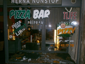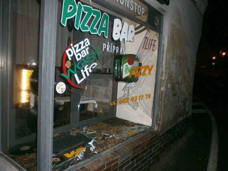 Obsluha baru West life přivolala nad ránem strážníky ke rvačce, při níž došlo k poničení majetku – rozbití výlohy (na foto). Agresoři si k ručnímu vyřizování účtů vybrali venkovní prostor, přesto se škodám nevyhnuli. Na místě incidentu se strážníci sešli spolu s policisty.