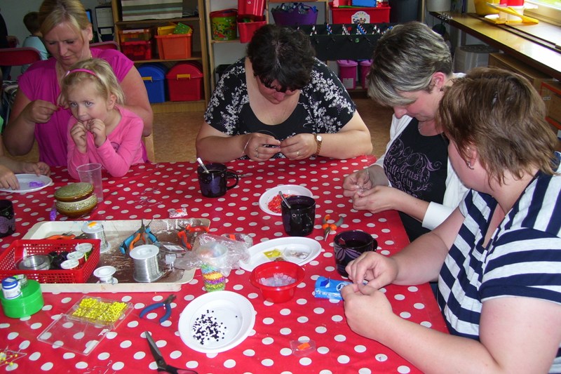 „Maminky se na posledním pracovním setkání ve školní družině ptaly, co nás čeká příště. S drátem a korálky ještě nepracovaly, tak jsem vymyslela akci ‚náhrdelníky‘. Nejen maminky se těšily a opravdu jich se svými dětmi přišlo hodně. Vše k „motání“ bylo připravené – drátky, korálky a různé kleště. „Já ale nejsem moc zručná,“ řekla jedna maminka. To přece nevadí, s korálky se nedá nic zkazit všechno jde, když se chce. A také šlo. Do vyrábění se daly i děti a práce jim šla od ruky, vždyť stále něco ve svém oddělení vyrábí a tak jsou moc šikovné.