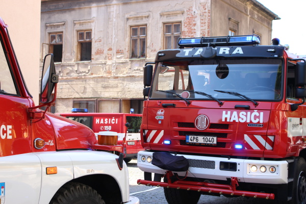 Spořádaný odchod před školu, žádná panika, hasiči vyvádějící uvězněné osoby ze zakouřených prostor pomocí speciálních masek, nebo je evakuují z ohrožené budovy za pomoci výškové techniky.