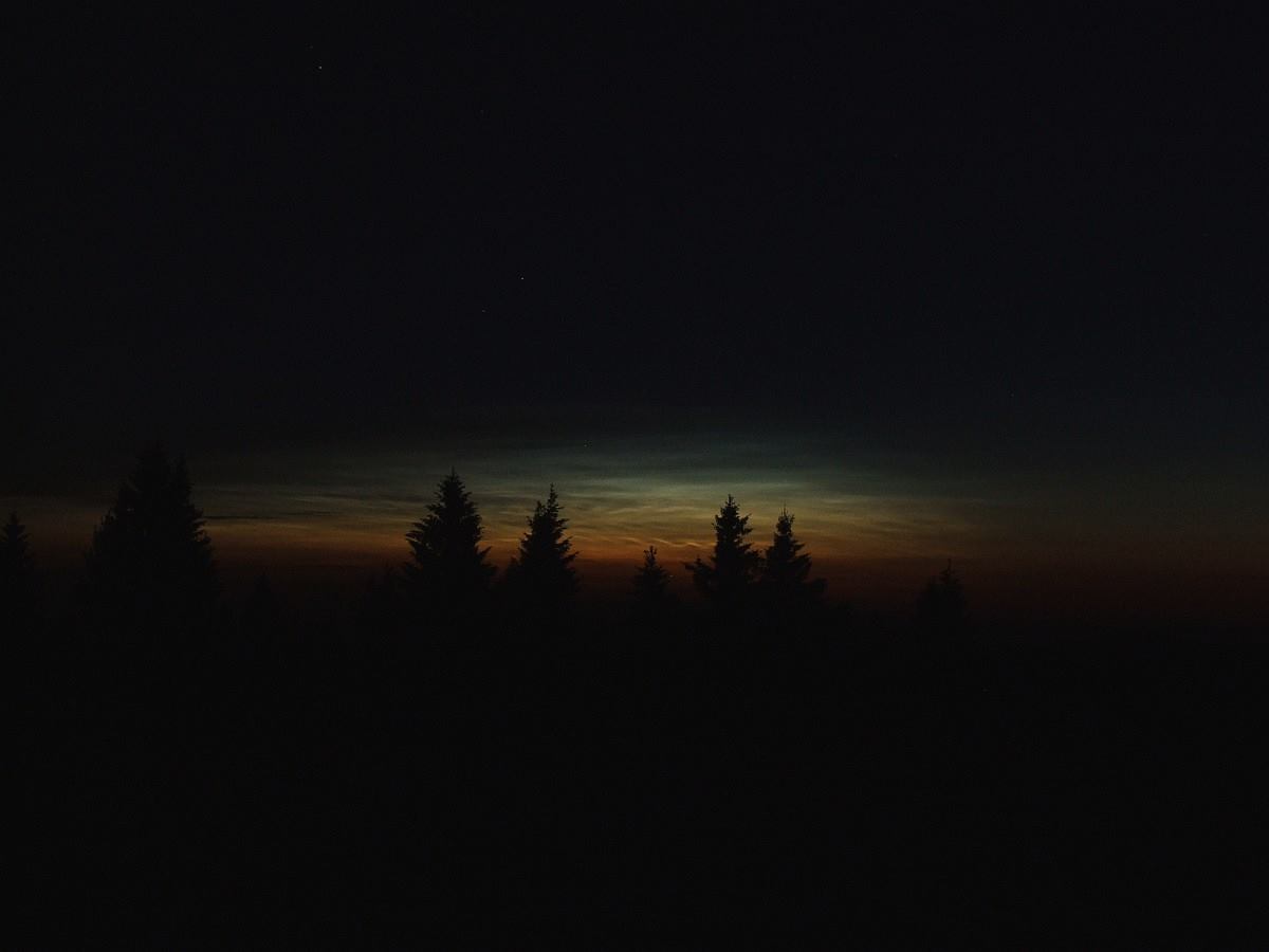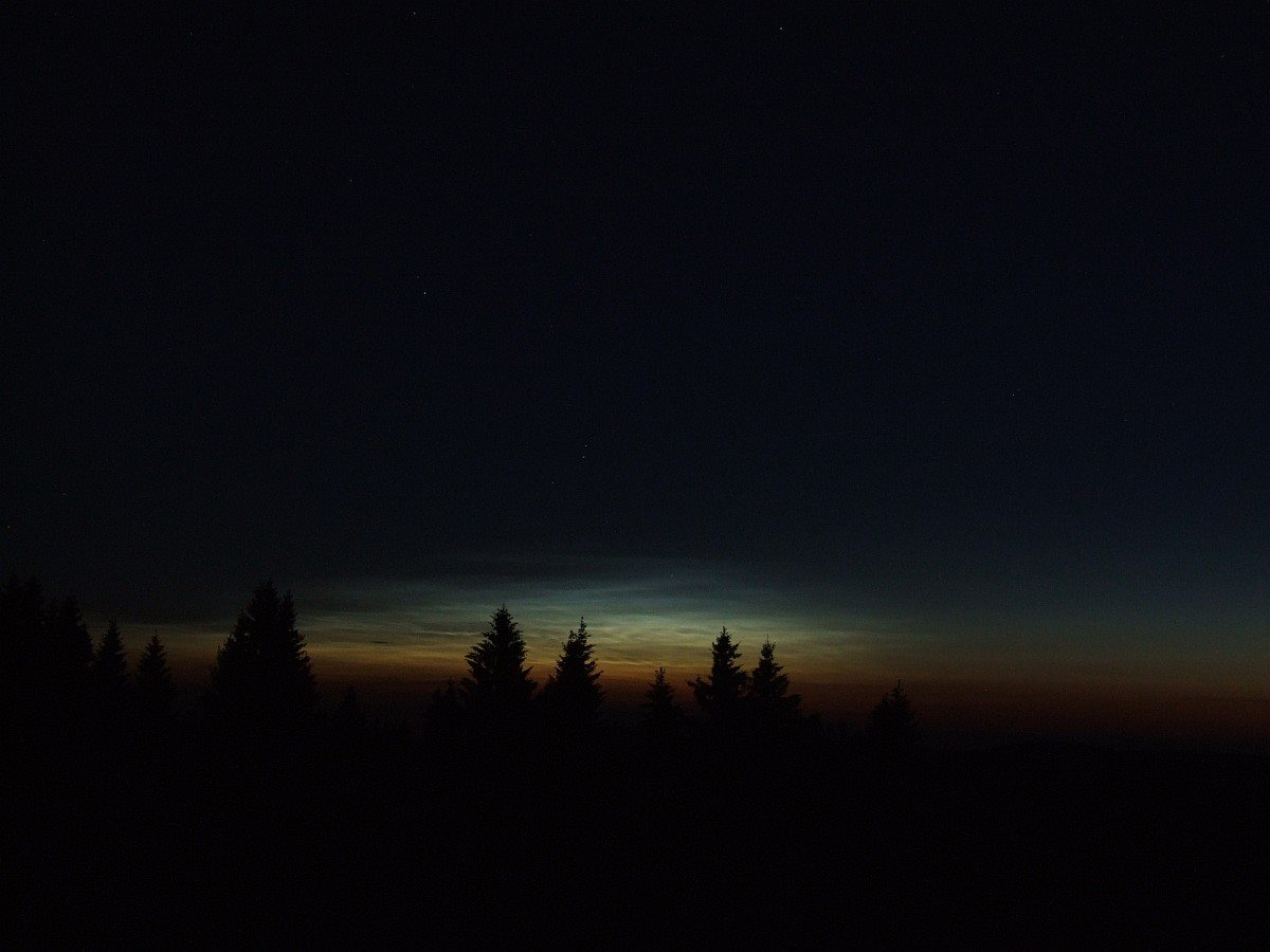 … dnes ráno jsem se dočkal a viděl jsem nádherný jev spojený u nás s letním slunovratem. Spal jsem venku pod hvězdami a nařídil si budíka na 2:45. Byla ještě skoro tma, hvězdy jiskřily, ve velmi slabounkém větru panovalo v lesích naprosté ticho. Vysoukal jsem se z mokrého spacáku. Vytvořila se bohatá rosa, místy i jíní, teplota při zemi totiž klesla až na -1,6°C (podle skleněného minimálu). Sešel jsem dolů k louce nad churáňovskými chalupami. A tu se podívám doprava a zhruba v 330°, tedy překvapivě trochu od severu k západu, vidím onu stříbřitě namodralou závojovitou stěnu. Noční svítící oblaky září v plné kráse.