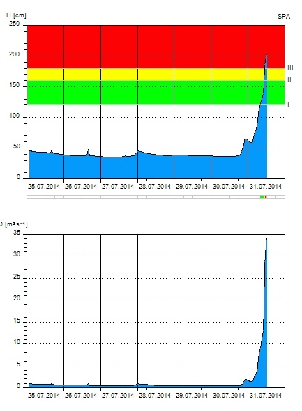 Zlatý potok v Hracholuskách se drží na 1. povodňovém stupni a na druhý stupeň zřejmě nedosáhne, aktuální hladina se drží lehce nad 90 cm a stoupá jen po centimetrech. Včera, tj 30. července byla výška 16 cm. První stupeň hlásí ještě Křemežský potok v obci Brloh, potok je na rychlém vzestupu a nelze vyloučit 2. povodňový stupeň.