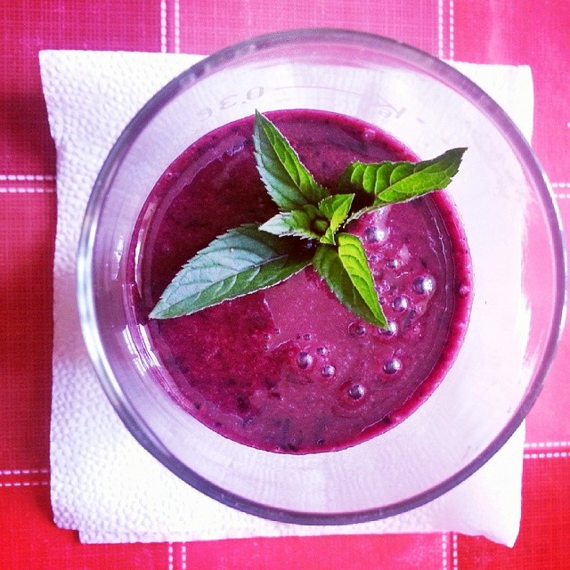 * Do mixéru si připravíme 1 banán, 150 gramů borůvek, 2 lžíce vody, třtinový cukr podle chuti.