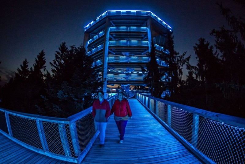 Ještě dvě srpnová úterý bude otevřená až do 23 hodin. Vyhlídková věž září do tmy barvami, což zajišťují speciální světla. Mimo úterky svítí jen ochoz. Noční stezka už o prázdninách přilákala stovky lidí.