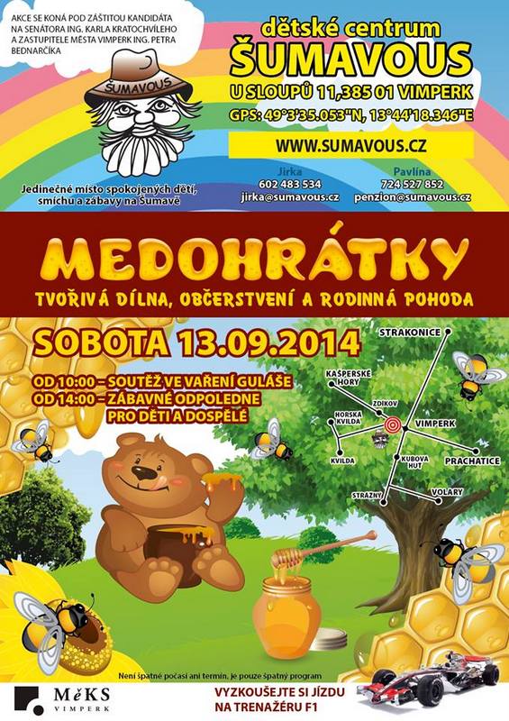 Zveme vás na další Medohrátky. Co vás letos čeká? Divadelní představení, plnění včelích úkolů, povídání o včelkách, tvořivé dílničky, vyzkoušet si můžete trenažér F1, tatínci se mohou pokusit zdolat rekord ve šlapací formuli a maminky mohou ochutnat vynikajíci medovinu. Na závěr bude vylosována hlavní cena ze slosovatelných letáků, které jsme letos rozdávali na Vimperském kašpárkovi. Máte se na co těšit. My se těšíme na vás. Na viděnou v sobotu.