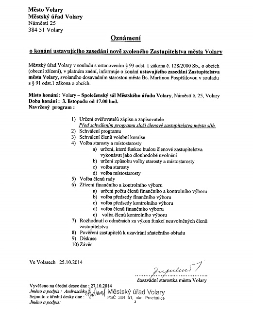 Ustavující zastupitelstvo se uskuteční ve Volarech první listopadové pondělí, tedy 3. listopadu od 17. hodin ve společenském sále volarské radnice.