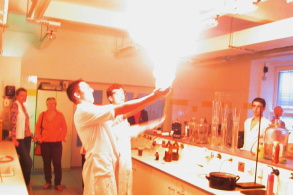 k přesunu do laboratoře, kde došlo ke slavnostnímu přestřižení pásky v barvě slonové kosti, která ladila nejen s laboratorními stoly, ale i s oblečením většiny přítomných dam. Po chvilce napjatého čekání se na scéně opět po několika letech objevil „pekelný hliník“, tentokrát pevně svázaný stěnami nové digestoře. Všichni přítomní následně prošli zkouškou ohněm a s úlevou zjistili, že díky jejich poctivosti je plameny opravdu nepálí.