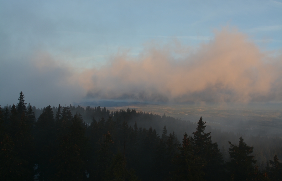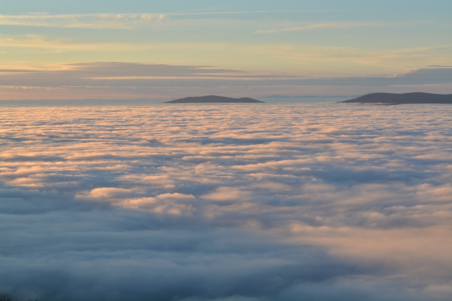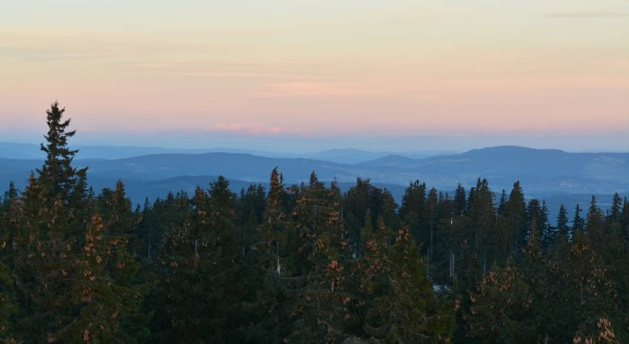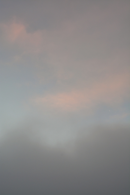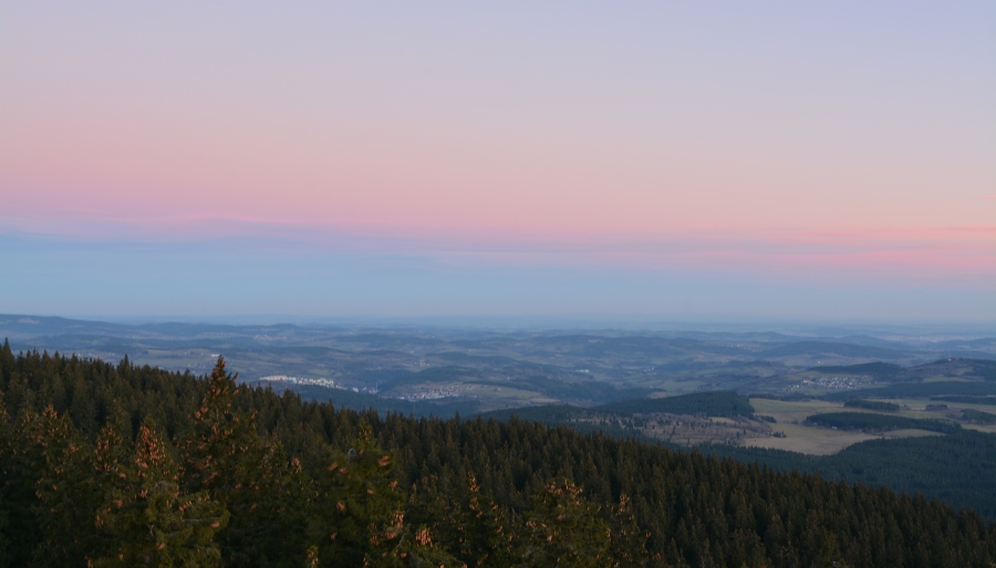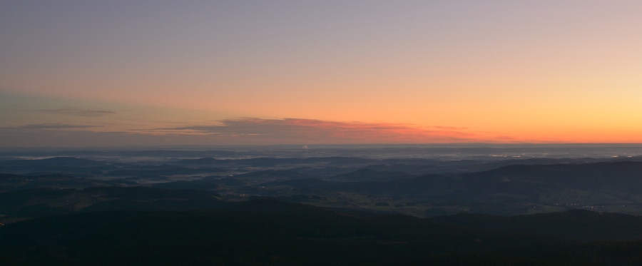 Záhy se ukázalo, že mlha jen o málo převyšovala rozhlednu, neboť shora se stále více začala prosazovat volná obloha a posunula barevné tónování výrazně k odstínům modři.