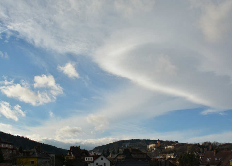 Zatím nenápadné, ba v celkovém rozpoložení krajiny zajímavé oblačné pásy však rozhodně mají cosi za lubem …
