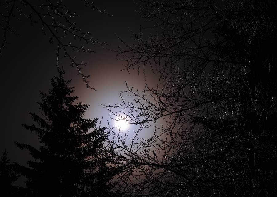Konečně nám mrazík trochu více vystrčil drápky – ve Vimperku stlačil rtuť teploměrů na čtyři stupně pod nulou a pod Boubínem si pak na jeho půvabné výtvory ve větvích stromů posvítil ubývající měsíček. Sobotní fáze úplňku nám sice byla zapovězena vleklou mlhou, ovšem nad dnešním ránem to vynahradila nejen krásná koróna, …