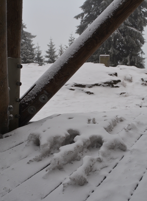Přes noc též připadl další centimetr sněhu, ale, jak se ukazuje, celkovému stavu bílé nadílky to s ohledem na oteplení pranic nepomůže. Zajímavý vzorek dosavadního vývoje se nabízí před vchodem do rozhledny – vypovídá o míře postupného slehávání a ledovatění onoho čtvrtmetru, který tu byl k vidění v minulém týdnu.