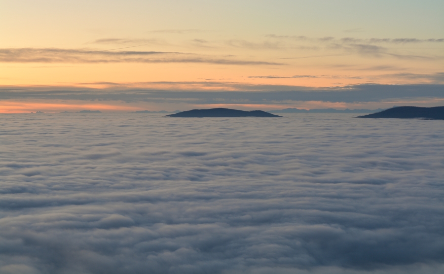 Právě k němu totiž mířila veškerá mlha, i tentokrát k nám hnaná vzpomenutým silným západním větrem – dnes prakticky ve výši rozhledny. Krátce po sedmé hodině ranní byla ještě dobře vidět oblačnost na východním obzoru, včetně bližší, jež od špičky Bobíku dále opticky halila vrchol Chlumu a dotýkala se i Kleti.