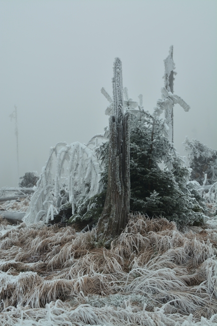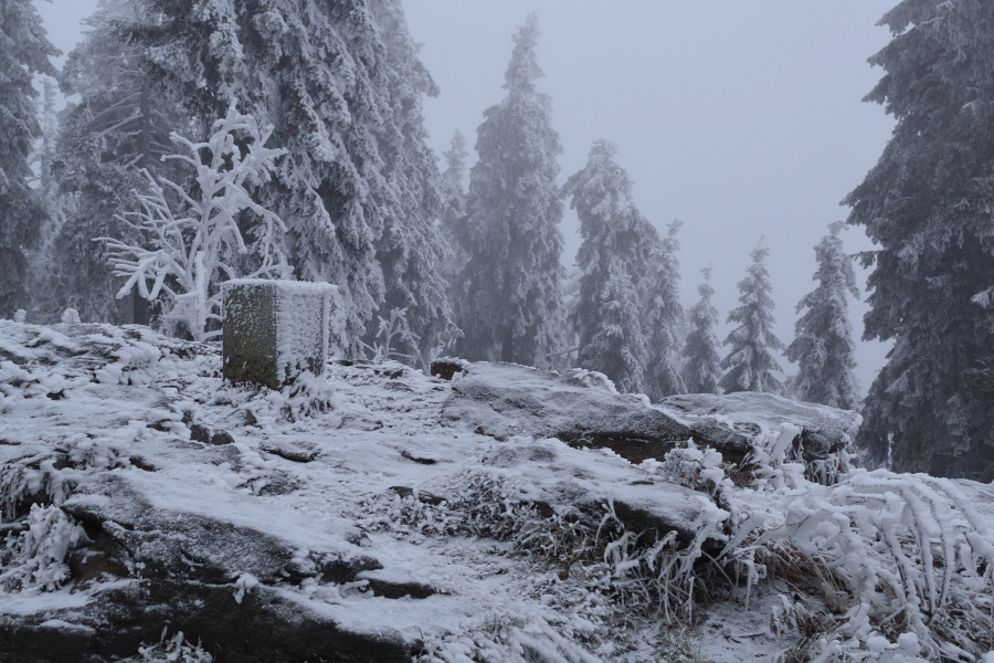 Cestou vzhůru si člověk připadal tak trochu jako neposlušný školák, tahaný čím dál více za uši – ovšem zde pouze stále sílícím mrazíkem, nahoře vyčíslitelným šesti stupni pod nulou. Boubín opět sahal po mlžné čepici, …
