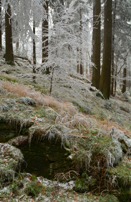 … protože teplota se zcela zjevně drží pod nulou (přesnou níži zatím stanovit nelze, neboť včerejší vichr, čímž budiž nad jiné dokumentována jeho nebývalá síla, odfoukl teploměr z rozhledny kamsi do hloubi okolních lesů – je tedy nutno spokojit se coby s důkazem se slovním svědectvím o silnou námrazou obaleném fotografově plnovousu).