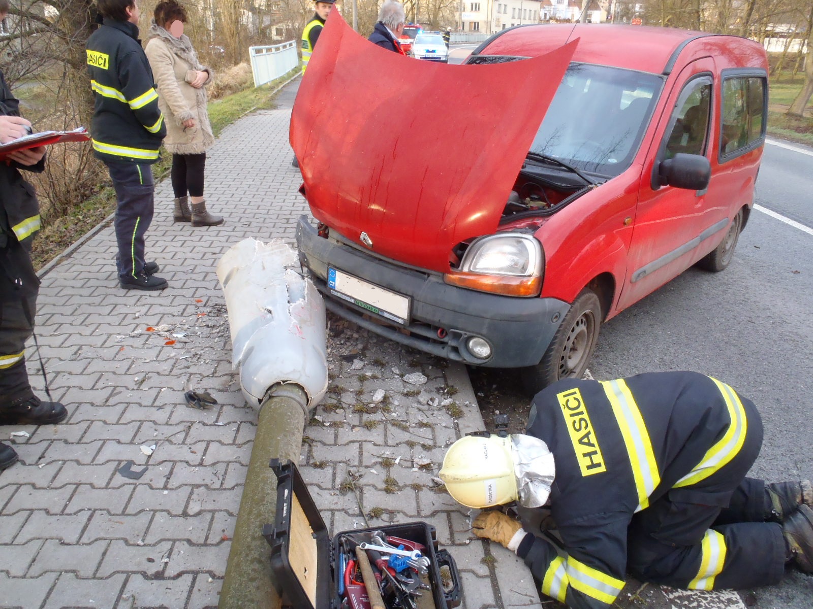 Třemošná – kolize osobního auta s veřejným osvětlením, za železničním přejezdem, si vyžádalo jedno zranění. Hasiči pomohli ZZS na místě zraněnou osobu ošetřit a po zdokumentování nehody Policií ČR odstranili auto i poškozený sloup z komunikace.
