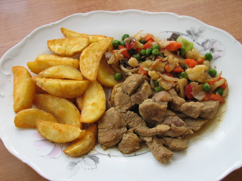 Když už je masíčko mekčí, začneme smažit americké brambory.
