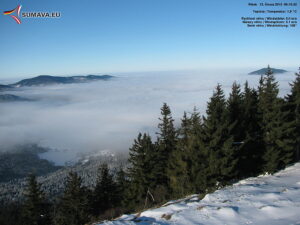 V posledních dnech panuje na Šumavě inverzní ráz počasí, horské polohy zažívají celodenní sluneční svit a teploty stoupající vysoko nad bod mrazu, v mrazových kotlinách