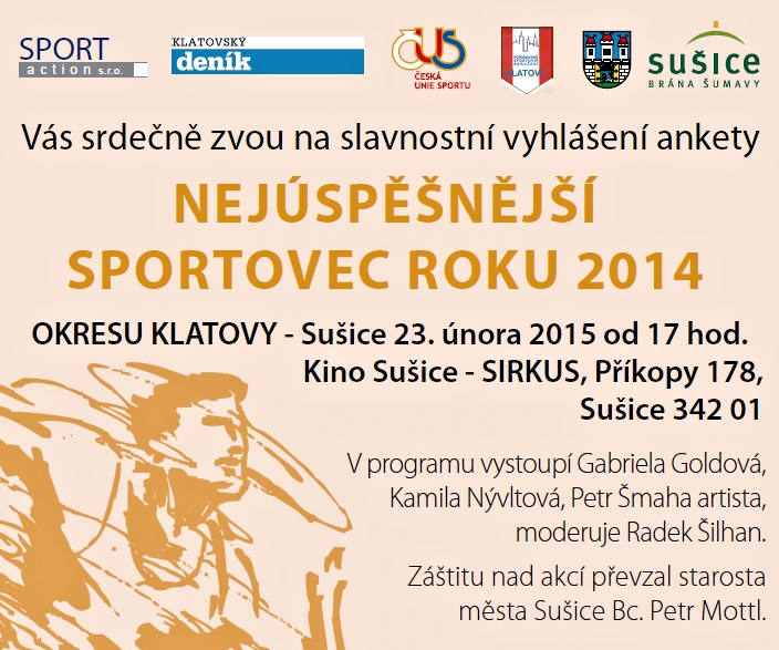 Slavnostní vyhlášení vítězů ankety o Nejlepšího sportovce klatovského okresu roku 2014 proběhne už dnes v podvečer v sušickém kině. Akce, při níž jsou vyhlašováni a oceňováni sportovci, kteří dosáhli největších úspěchů a nejvýrazněji tak reprezentovali klatovský okres, se koná pravidelně v Klatovech, letos poprvé změní místo. Anketu společně vyhlašují Deník, Pošumavské sportovní sdružení (PSS) Klatovy se společností Sport Action s. r. o.