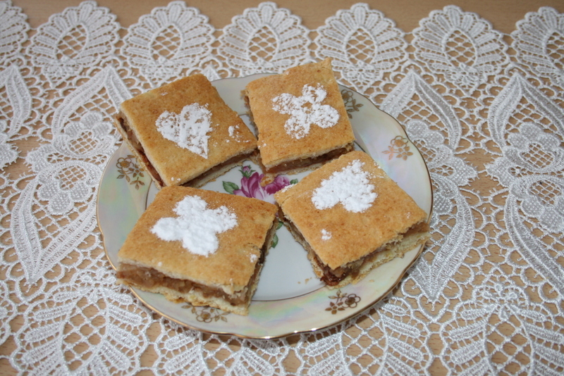 Studené brambory oloupáme, nastrouháme, přidáme ostatní suroviny a zpracujeme na těsto. Rozdělíme jej na dvě poloviny a rozválíme na dvě placky. První z nich rozválíme přímo na pečícím papíře a přeneseme na plech. Těsto na plechu posypeme jablky nastrouhanými na hrubém struhadle, přidáme rozinky, skořici a cukr. Druhou placku přiložíme navrch. Pečeme ve předem vyhřáté troubě na 170 stupňů dvacet minut, poté teplotu snížíme na 160 stupňů a ještě dvacet minut dopékáme.