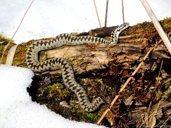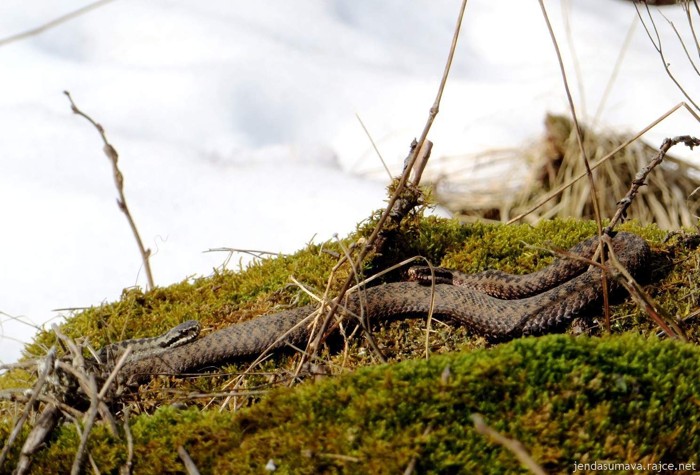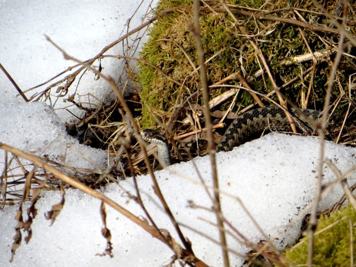 V kalendáři máme sice ještě pořád astronomickou zimu, to ale očividně nevadí zmijím, které zřejmě vylákaly hřejivé sluneční paprsky bez ohledu na pranostiky. Svátek má Jiří až za více než měsíc, zmije už ale nevydržely ve svých úkrytech čekat a využívají míst, kde sněhová pokrývka již roztála, teploty totiž vystoupily 17. března na jarní hodnoty kolem 13°C.