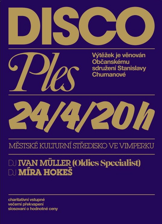 Již tento pátek se na vás těšíme v MěKS. Připravili jsme pro vás Disco Ples. Výtěžek je věnován Občanskému sdružení Stanislavy Chumanové.