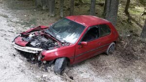 Včerejší nehoda mezi Vimperkem a Kvildou. Se zraněním – tržné rány na hlavě. Auto dostalo smyk na štěrku a narazilo do stromu.