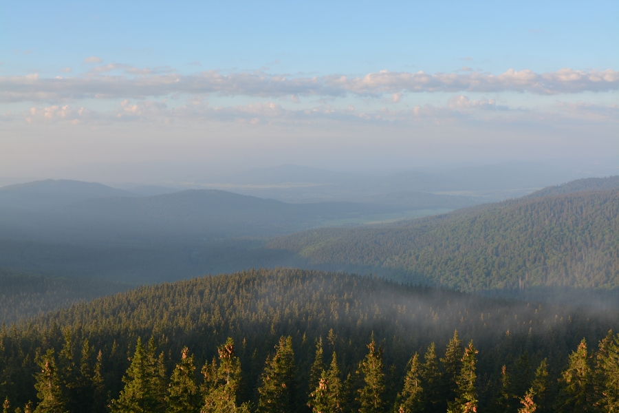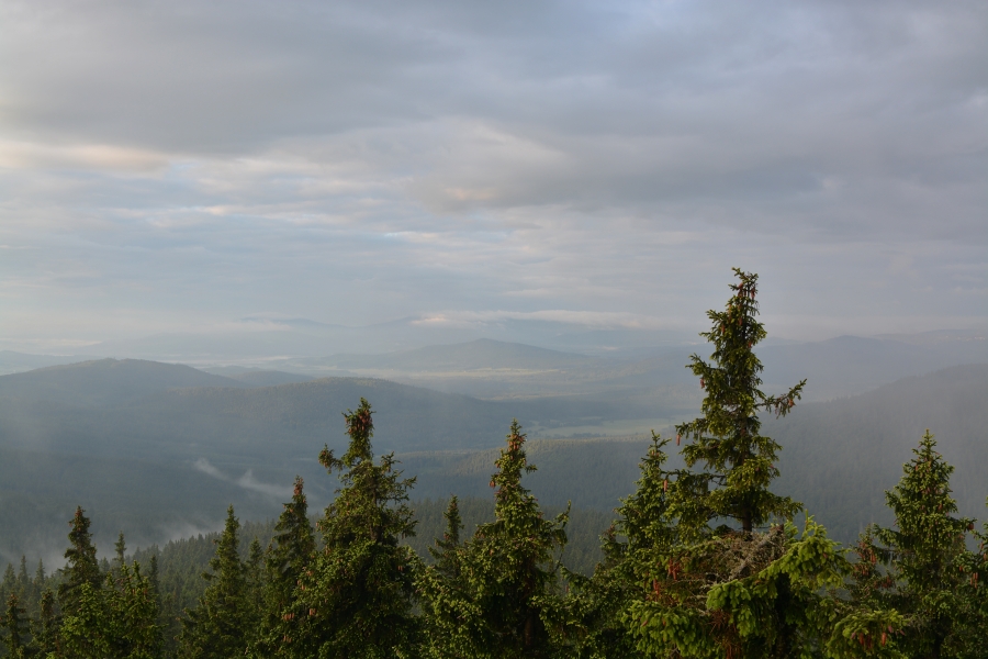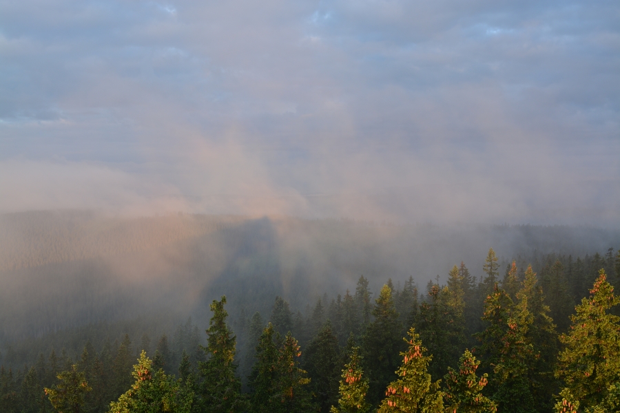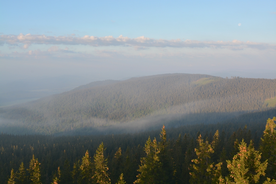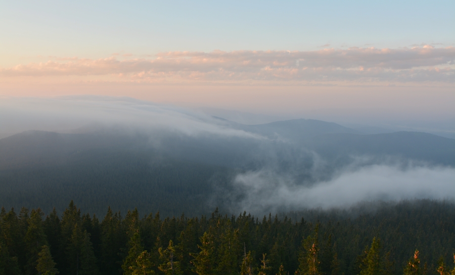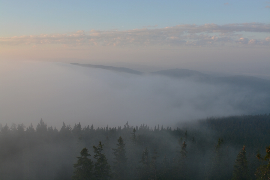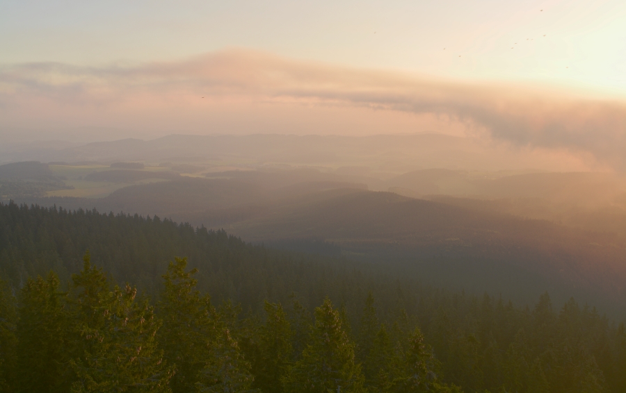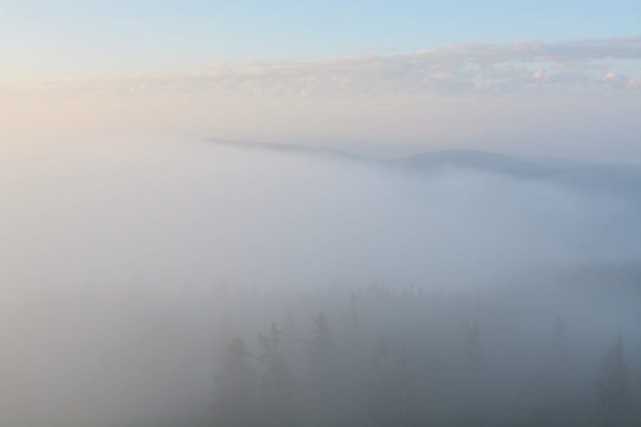 Už od Korkusovky se takřka ještě v naprosté tmě prozradila víceméně neočekávaná mlžná čepice na severovýchodní straně boubínského vrcholu – právě tam se pak okolo půl páté nejen potvrdila, ale postupně přikryla celou špičku hory včetně rozhledny.