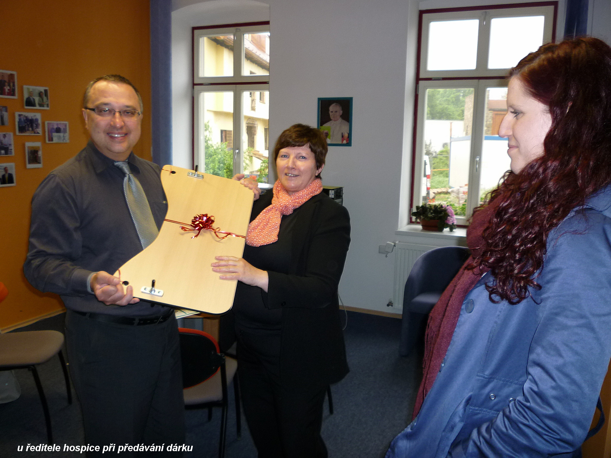 Dar čtyř jídelních desek Komfort v ceně 4 975 Kč byl vybrán na základě požadavku pracovníků hospice. Společně se zástupci sdružení předávala tento dar slečna Veronika Spiegelová z Vimperka. Právě Veronika věnovala sdružení finanční výtěžek ze svého koncertu, který proběhl v Městském kulturním středisku ve Vimperku loni začátkem prosince. Jejím přáním bylo zakoupení potřebných věcí právě pro prachatický hospic.