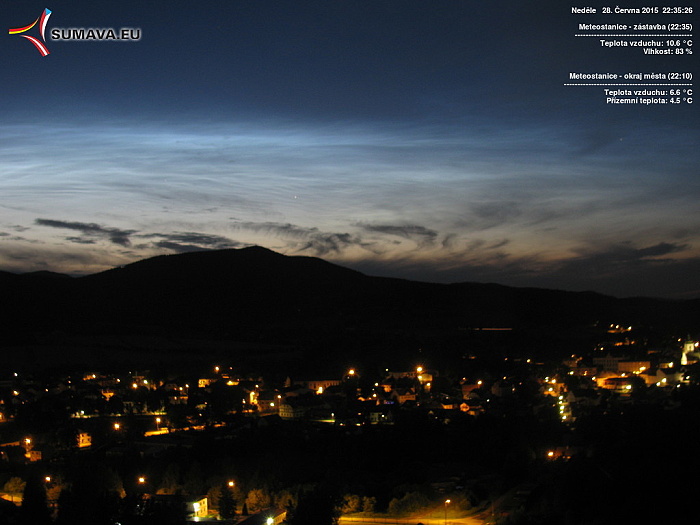 V neděli 28. června po 22 hodině zachytila naše webová kamera ve Volarech vzácný druh oblaků, které jsou viditelné pouze v období letního slunovratu. Jde o tzv. noční svítící oblaky (zkratka NLC) nebo také stříbřité oblaky.