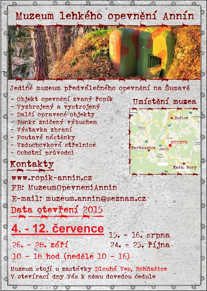 Od 4.-12. července bude také otevřené Muzeum lehkého opevnění Annín (meziválečné bunkry).