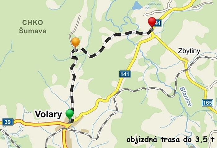 Na objízdnou trasu by se neměli vydávat cyklisté, zvolit můžou buď komunikaci z Volar do Blažejovic, která je nyní prakticky bez aut díky uzavírce a dále se u Zbytin napojit na cyklostezku do Prachatic a nebo zvolit cyklotrasu z Volar do Zbytin kolem bazénu Mlýnskou ulicí a dále k rozvodí.