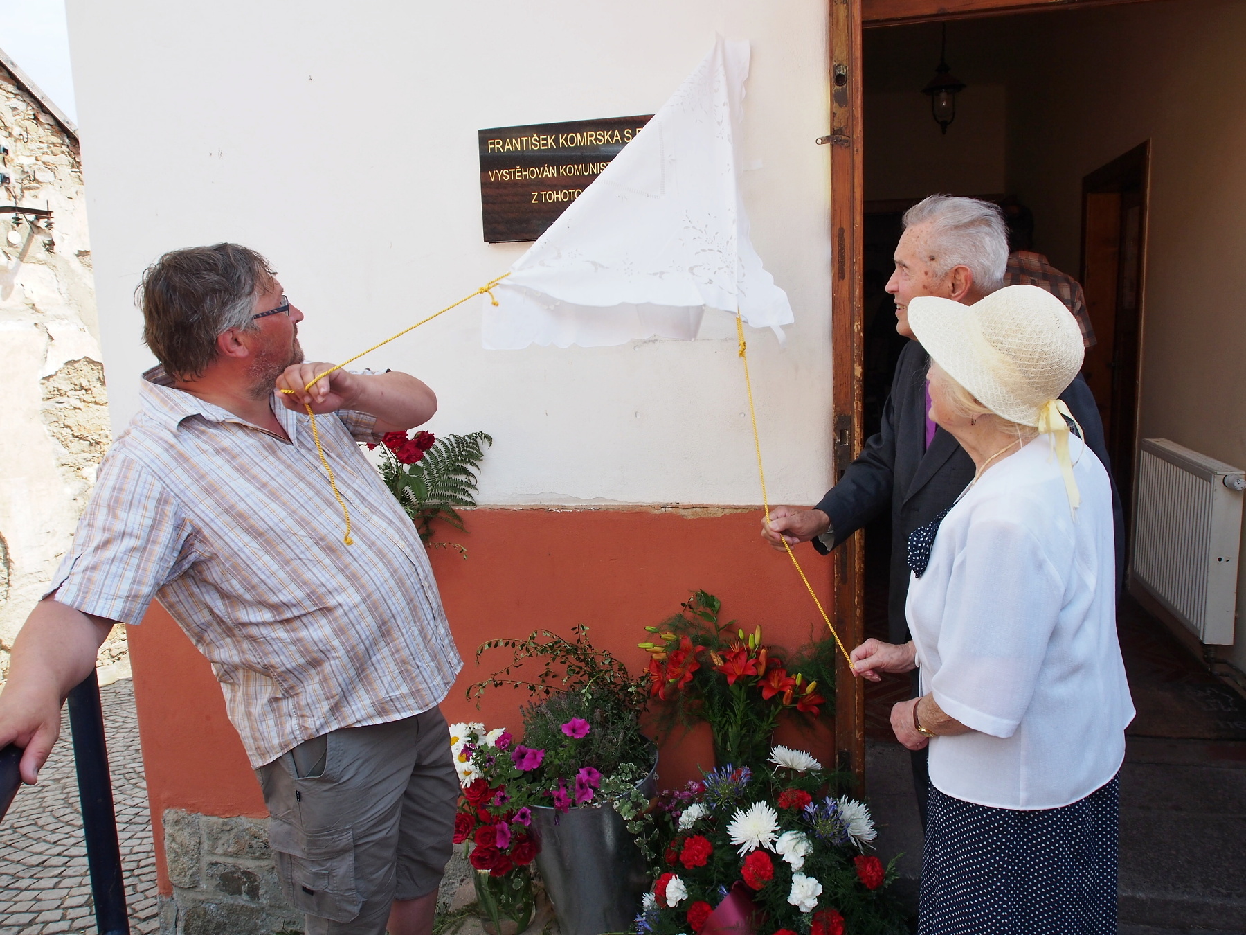 „František Komrska s rodinou, vystěhován komunistickým režimem z tohoto domu r. 1953“ je nyní napsáno na pamětní desce na budově místního hostince v Nahořanech. Deska byla odhalena předsedkyní a místopředsedou Konfederace politických vězňů ČR MUDr. Naděždou Kavalírovou a Ing. Františkem Šedivým. Třetím odhalujícím byl starosta Městyse Čestice Milan Žejdl.