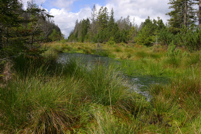 „Na celé Šumavě je přibližně 6000 hektarů rašelinišť, a téměř dvě třetiny z nich byly v minulosti odvodněny. S vysoušením se začalo už v 19. století, ale nejsilnější zásahy byly provedeny v 70. a 80. letech minulého století. Hlavním důvodem odvodňování bylo především zvýšení produkce dřeva z lesa nebo údržba zemědělské půdy,“ vysvětluje historii a důvody odvodňování rašelinišť na Šumavě botanička Iva Bufková. „Bohužel, každé odvodnění rašeliniště poškozuje. Pokud je dostatečně silné, může rašeliniště v průběhu několika desítek let i zaniknout a kromě jedinečného biotopu tak zmizí i plocha, která působí jako přirozená zásobárna vody hlavně v obdobích sucha. V minulosti bylo na Šumavě odvodněno zhruba 4000 hektarů rašelinišť, a i když ne všechny kanály jsou pro rašeliniště likvidující, je to dosti významná změna pro krajinu,“ doplňuje Iva Bufková. Podle údajů z průzkumu provedeného v devadesátých letech, je k obnově vhodných zhruba 2000 hektarů rašelinišť a mokřadů, z nichž více než čtvrtina je již hotova. K tomu ještě Správa Národního parku Šumava revitalizuje kilometry napřímených potoků. „Letos jsou na řadě Žlebský a Jedlový potok a okolní mokřady a rašeliniště na Zhůřském potoce.