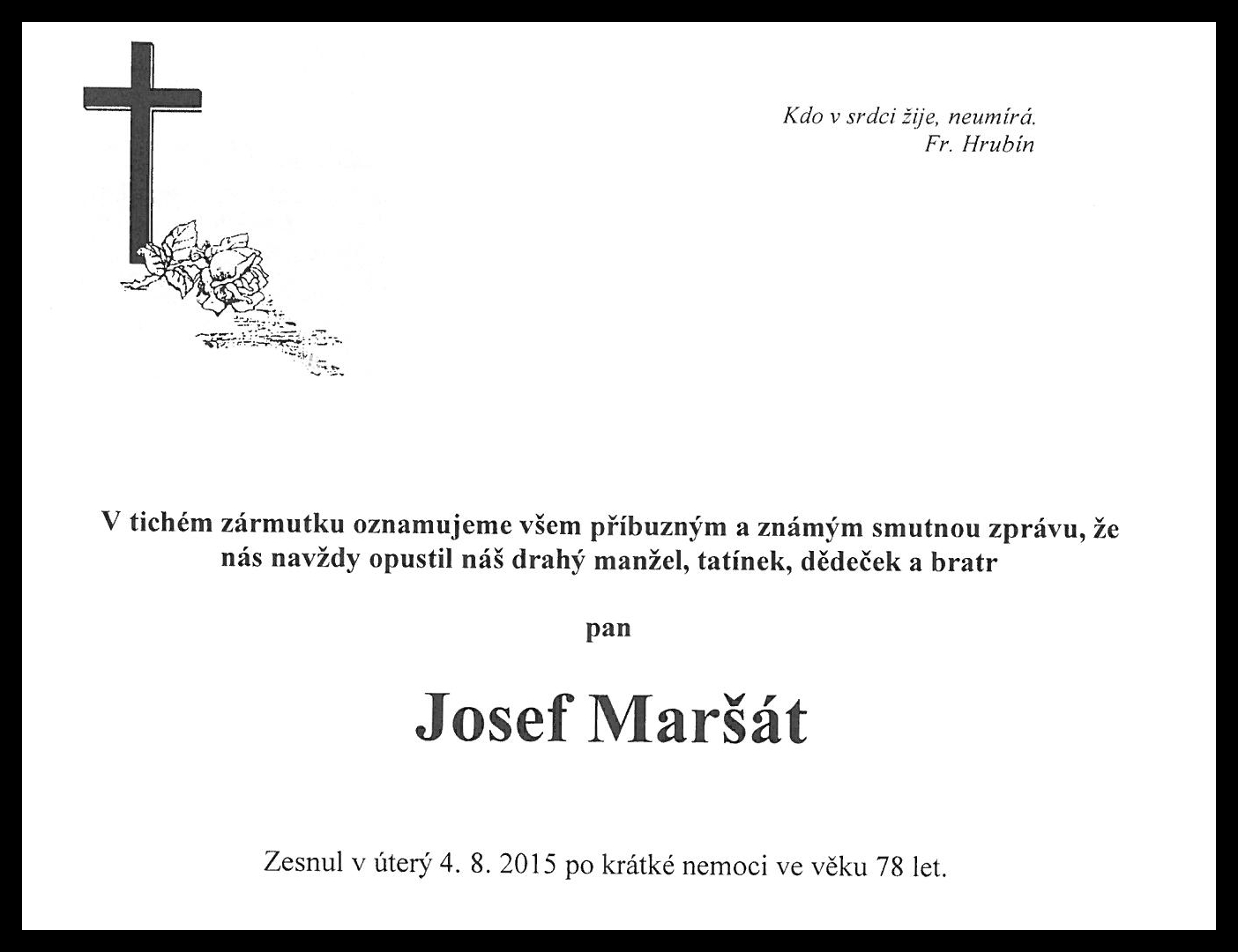 Upřímnou soustrast rodině vyslovuje starosta města, rada a zastupitelstvo města, v nichž pan Josef Maršát dlouhá léta působil.