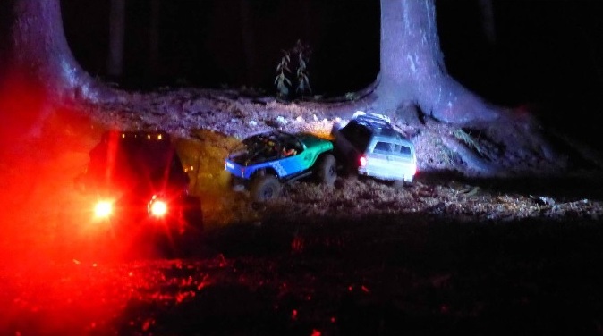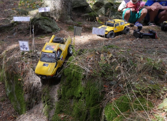 Mezitím se 39 soutěžících rozdělilo na 13 týmů a první čtyři týmy se přesunuly na startovní čáry. V lese na ně čekal náročný průjezd 90. branek, rozdělených do 4 sekcí. Zde šlo hodně o připravenost vozidla, jak technického stavu, tak vyprošťovací výbavu, zručnost jezdce a týmové spolupráce. Největší pomocník byl naviják, který byl nutností, mít alespoň jeden v týmu a bez kterého by se to neobešlo. U plno branek se muselo první vozidlo pomocí navijáku vytáhnout a poté zapřáhnout svého kolegu na provaz a pomoci mu vyjet nahoru. Využívalo se úplně vše, od přejezdových plechů, vyprošťovacích kladek po řetězy a provazy. Vzájemně si vozidla pomáhaly při převrácení na kola a myslím, že to byla pro přihlížející moc hezká a zajímavá podívaná. Terén si každý pochvaloval, i přes to že některé místa byly opravdu extrémně náročné. Párkrát se stalo, že se model začal kutálet a skončil 30m dole pod kopcem, což mělo jednou kritické následky pro jednoho soutěžícího s modelem Landrover Defender, kde došlo k velkému prasknutí karoserie, že musel odstoupit ze závodu.
