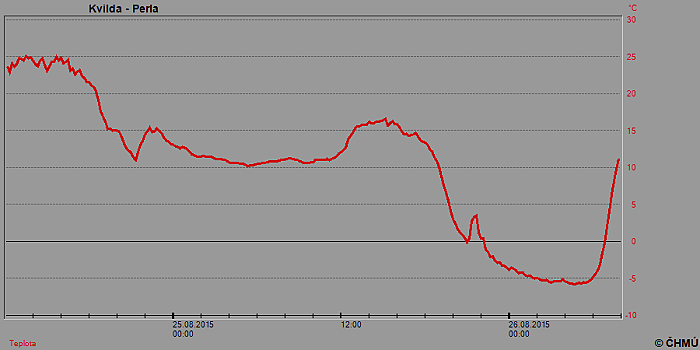 Nejnižší teplota letních prázdnin byla zaznamenána 26. srpna na stanici Perla, kde klesla rtuť teploměru až na -5,8°C. Druhou nejnižší teplotu naměřila stanice na Březníku -3,2°C, následovaly Volary s minimem -2,6°C. Překvapivě tepleji než ve Volarech bylo tentokrát na Rokytské slati -2,4°C i na Horské Kvildě -1,8°C. Mrzlo také na stanicíh Borová Lada, Hliniště, Řasnice, Zbytiny a Pasečná.
